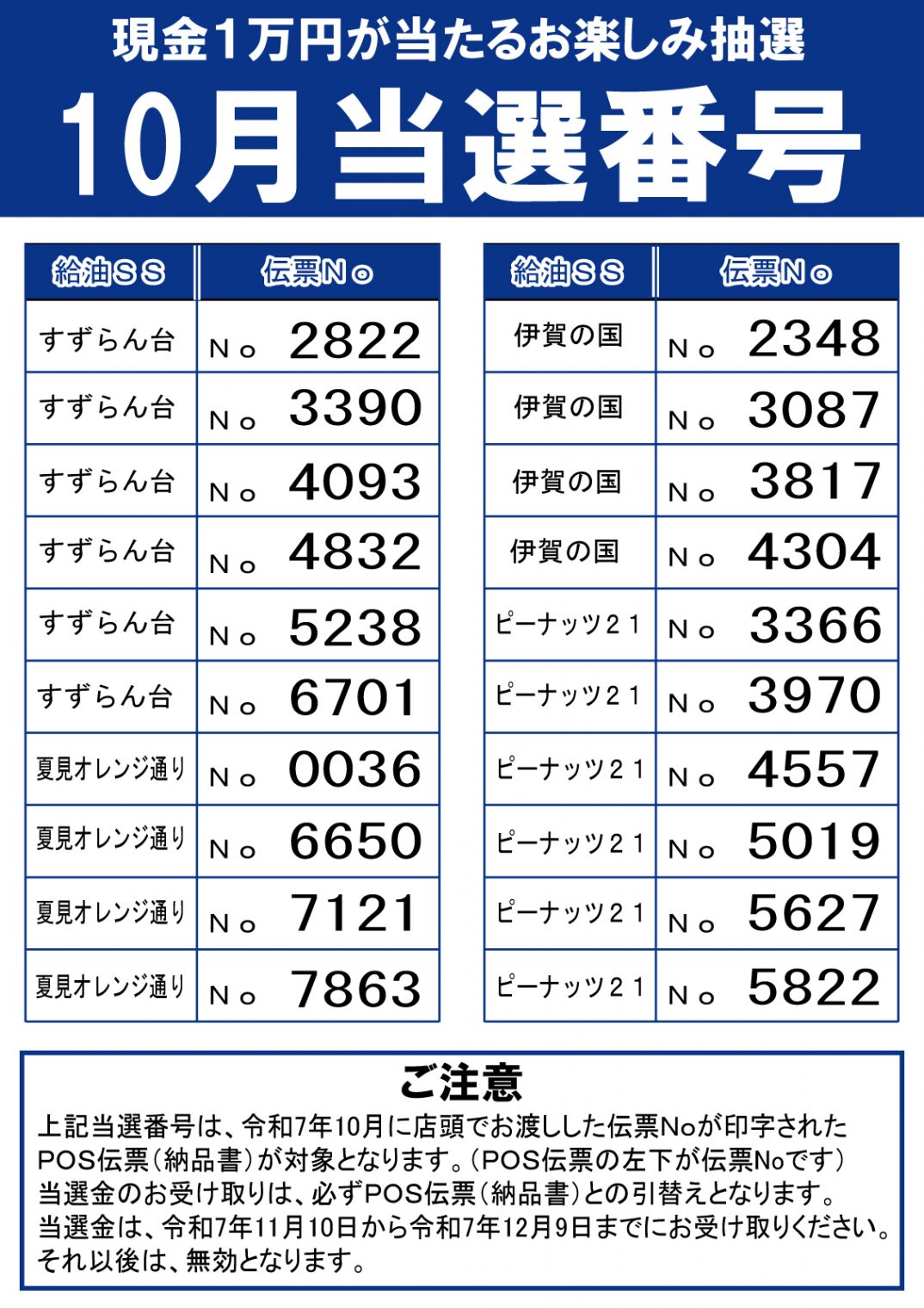10月当選者発表! 2025.11.20 10月当選者発表! 毎月現金1万円が20名様に、総額20万円が当たるレシート抽選 10月当選者の発表です! POS伝票(レシート)左下に印字された4桁の数字が、伝票No.となっております!