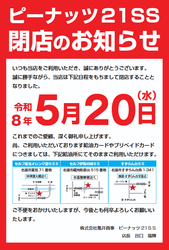 誠に勝手ながら令和8年5月20日(水)を持ちまして閉店することとなりました。